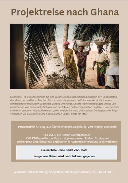 Ein Insight-Trip ermöglicht Ihnen einen authentischen Einblick in unsere Projekte und den Lebensalltag der Menschen. Lernen Sie unsere Projektverantwortlichen vor Ort persönlich kennen. Für 2026 ist im Herbst eine Reise nach Ghana geplant. Die Zeit für eine Reise nach Malawi ist noch nicht konkret festgelegt. Kommen Sie bei Interesse doch einfach auf uns zu.